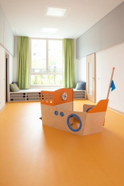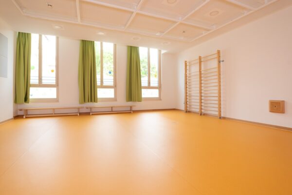 Zusätzlich befindet sich ein größerer Mehrzweckraum mit Schwerpunkt Bewegung und Sport auf der nördlichen Seite der Einrichtung. Die Einrichtung verfügt über Linoleum Boden und über Fußbodenheizung im gesamten päd. Bereich. Klare fröhliche Formsprache und sparsame Deko sind gewünscht, um eine Reizüberflutung der Kinder zu vermeiden.