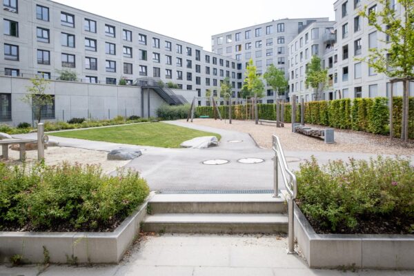Die Räume des Hauses für Kinder befinden sich in einem in einen Mehrparteienhaus. Die Gruppenräume eröffnen den Blick in den Innenhof des Gebäudekomplexes und den zur Kita gehörenden Spielplatz. Zwischen den Gruppenräumen der Krippe und der Kiga befindet sich jeweils ein Mehrzweckraum.