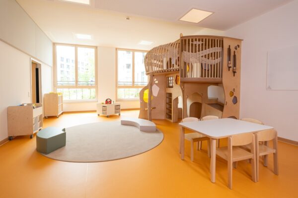 In den Kindergarten Gruppenräumen und im Eingangsbereich sind Baumhäuser mit zwei Spiel- und Sitzebenen eingebaut, die zusätzlich einen Spiel- und Bewegungsimpuls entsprechend dem Schwerpunkt „Bewegung und Sport“ der Einrichtung setzen.